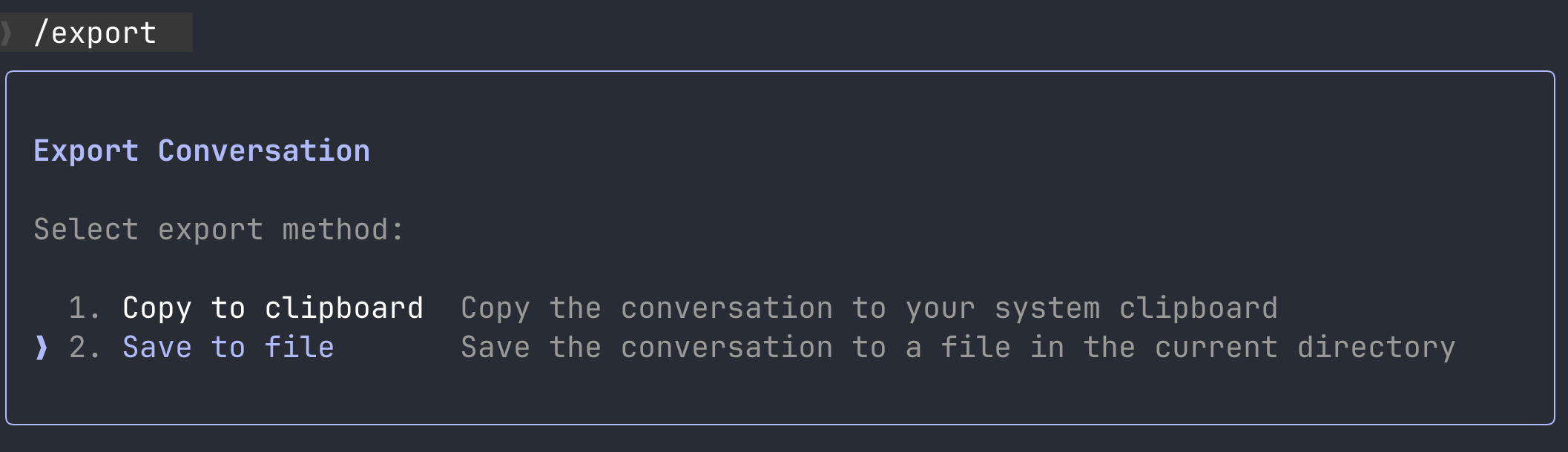 The /export command lets you save your entire conversation to a file or to a clipboard.